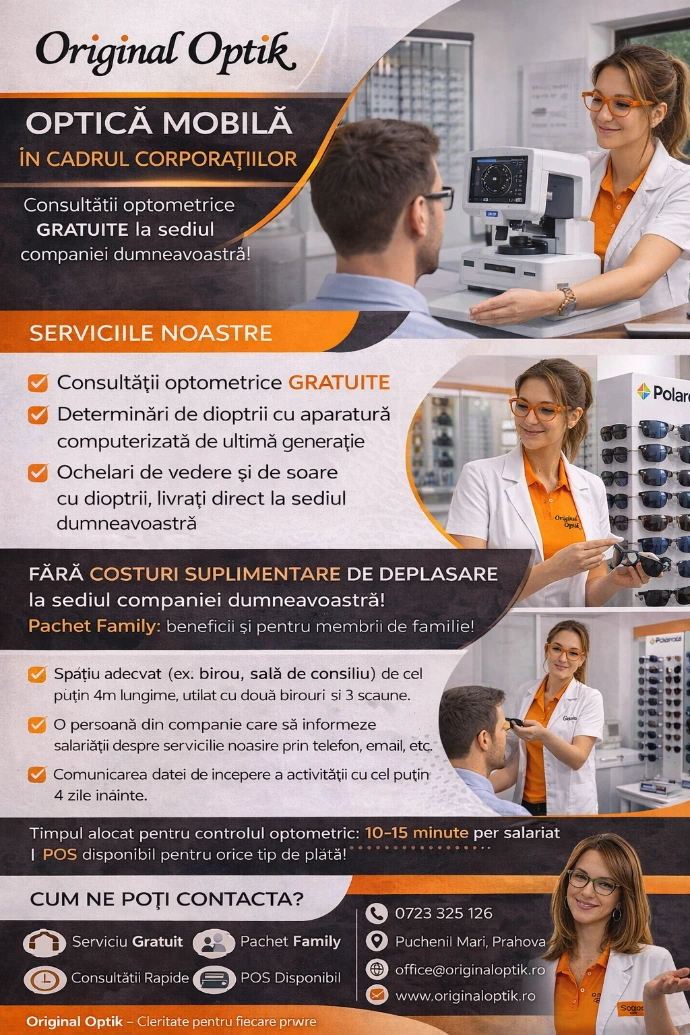 Acest serviciu este ideal pentru persoanele care nu se pot deplasa ușor, pentru angajații din companii sau pentru comunitățile din zone unde accesul la servicii optice este limitat. Oferim aceeași calitate a serviciilor și a produselor ca într-un cabinet optic, dar cu avantajul confortului și al economiei de timp.